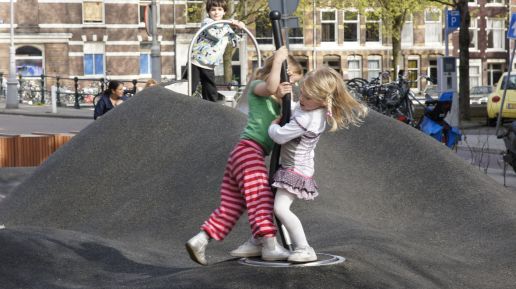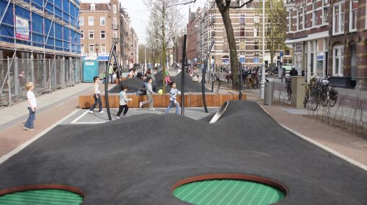 De Potgieterstraat is a typical dense Amsterdam street. Carve's intervention was firstly to rethink the street into a play street, making it accessible only for bikes and pedestrians. We designed a mogul landscape with integrated play objects, materialised in abstract black rubber. The play objects vary from crawling tunnel, spinners and trampolines to watersprayers and whispering tubes. The rubber can be used as a drawing surface, invites to jump, run and fall, thanks to its soft feel – while also reducing noise levels. The location has become an anchor for neighbourhood interaction, interlocking the surrounding blocks as well as people of different backgrounds and ages.