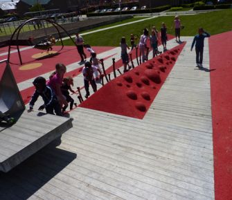 The new playground Van Campenvaart is located on an existing lawn and shaped as a folded red blanket with a strong graphic character. By constructing creases between a ramp, several angles are created. The undefined possibilities of the field challenges the boundaries of both (partially)disabled and non-disabled children. Intersecting routes allow children with different abilities to meet and help each other. In the playing-field, different climbing grips and tactile elements have been added, as well as a moving rubber mat. Whisper tubes, a wide slide, a ‘concave’ turntable and a hammock create additional play elements.